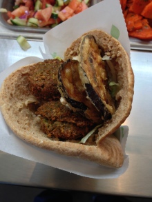 ファラフェル、ハムス、揚げ茄子をピタパンに入れてくれて